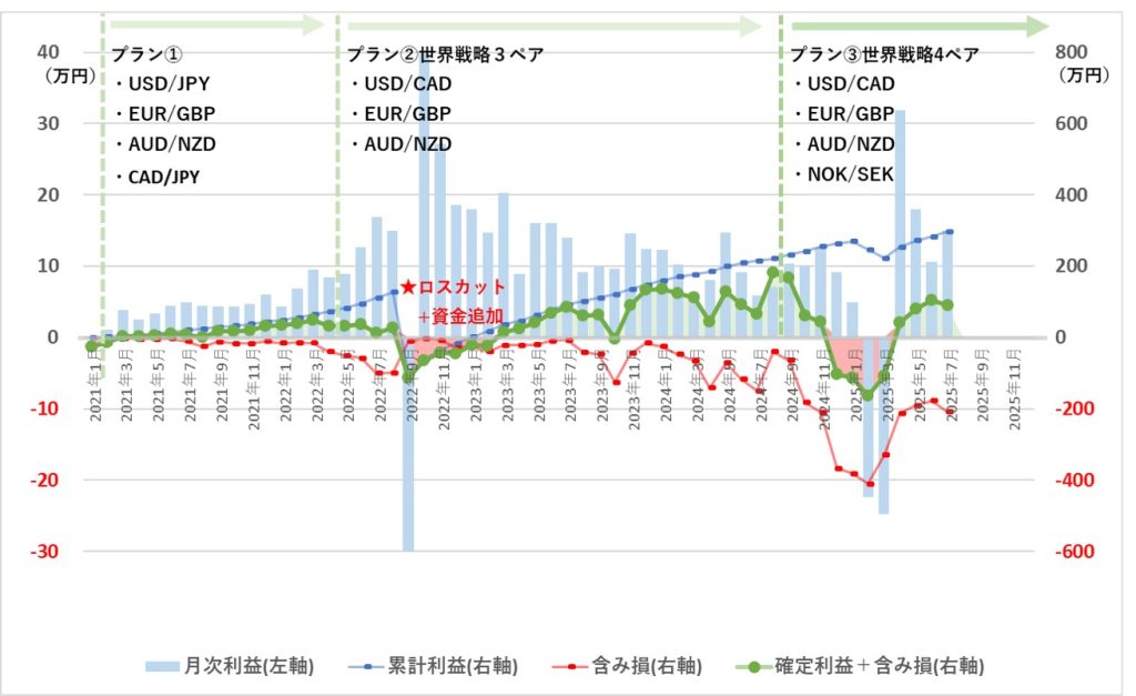 2022年はロスカットにより一時的な損失は出しましたが、累積ではプラス転換しており、2023年・2024年と続けて確定損益ベースではプラスで終えることができました。